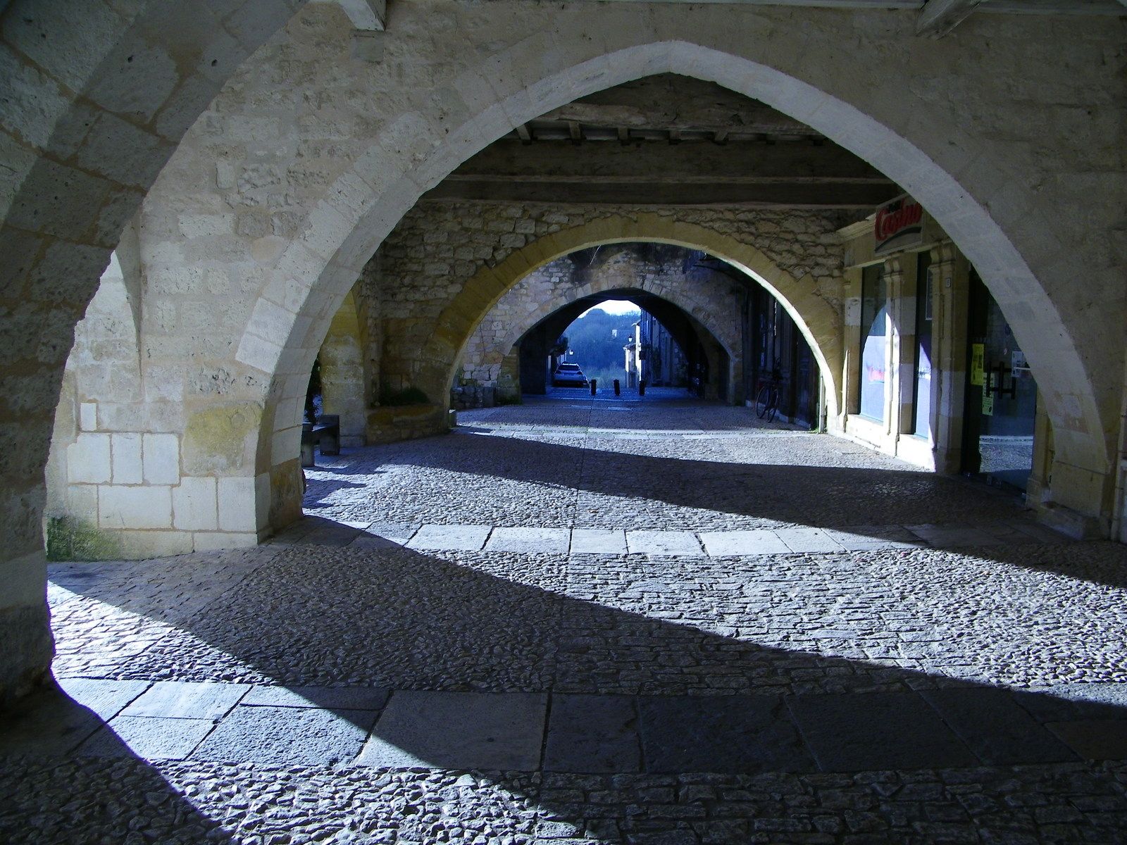 Photo prise il y a quelques jours à Monpazier, probablement la plus belle bastide anglaise du sud-ouest, au sud de la Dordogne. Ce jour-là le soleil d'hiver rasant pénétrait sous les cornières, jouant entre les arcades qui entournent la place centrale. Saison calme, la fièvre des visiteurs n'est plus là, pas plus d'ailleurs que le chant des cigales qu'évoque dans ses souvenirs Lawrence d'Arabie qui fit un cours séjours à Monpazier en 1908. Il était alors un pionner des excursions à bicyclette, parcourant la France à la recherche de grands sites médiévaux.